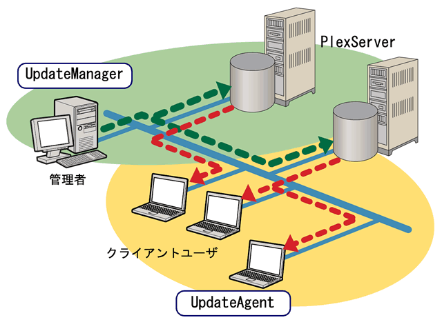 管理者によりリソースをPlexServerにアップロード・管理するUpdateManagerと、PlexServerからリソースをダウンロードしてクライアントをアップデートするUpdateAgentにより、クライアントユーザは使用するコンピュータ内のリソースを特に意識することなく最新の状態に保つことができ、管理者もクライアントコンピュータの状態を一元管理することができます。